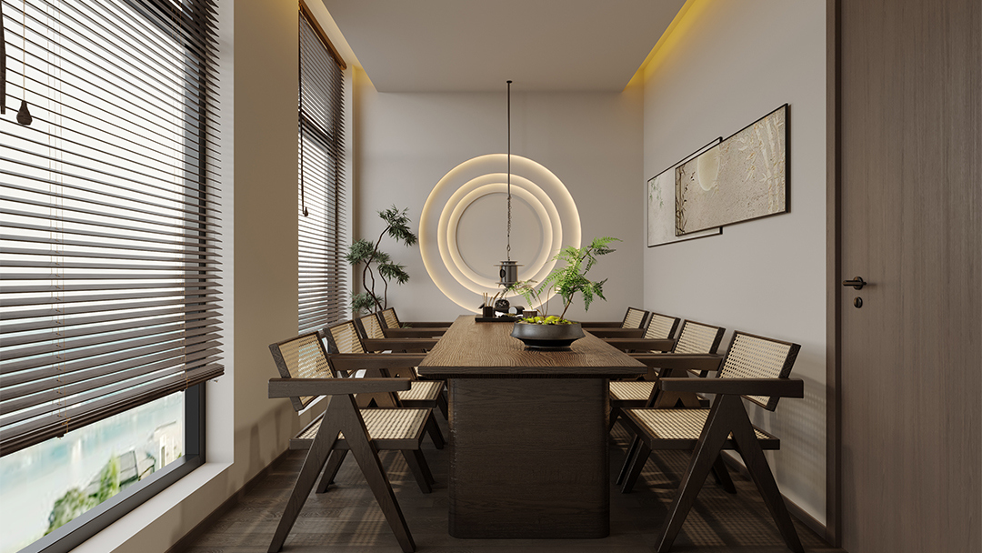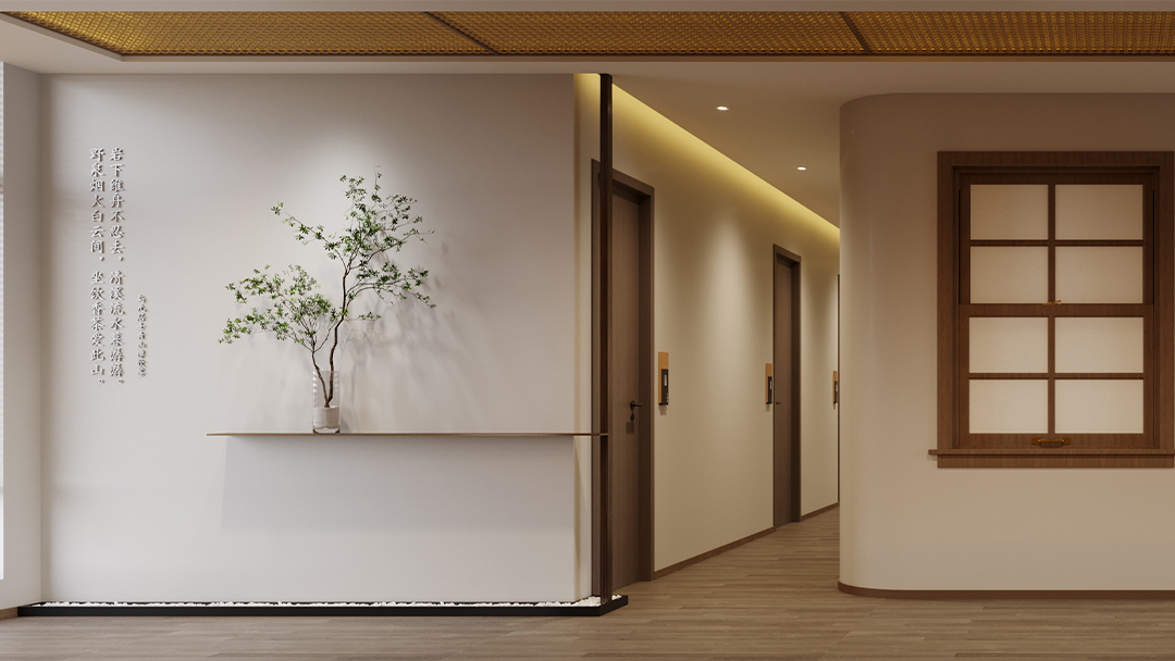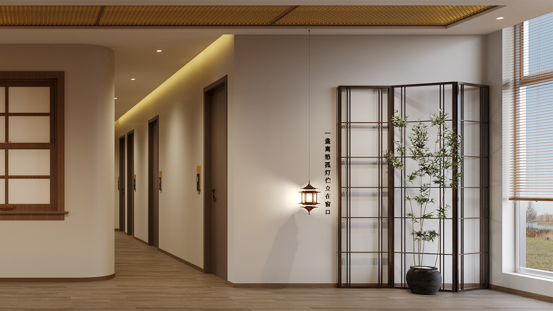 采用原木、竹編、素水泥等天然材質(zhì),搭配啞光金屬收邊條提升細(xì)節(jié)質(zhì)感;通過透光云石、鏤空屏風(fēng)與智能調(diào)光系統(tǒng),營造“虛實相生”的靜謐氛圍。 - 空間功能的禪意表達