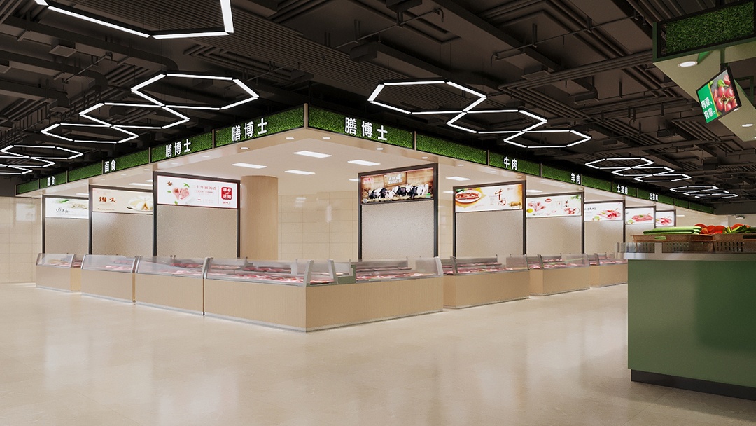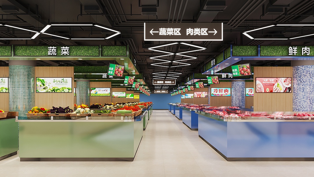 杭州生鮮超市裝修設計,巧妙運用色彩分區(qū),以藍色勾勒生鮮區(qū),綠色暈染蔬果區(qū),打造出別具一格的購物空間。踏入生鮮區(qū),靜謐而深邃的藍色調撲面而來,營造出海洋般的清涼氛圍。冷柜、展示架皆以藍色為主,與各類鮮活的海鮮、肉類相互映襯,凸顯品質與新鮮。移步蔬果區(qū),清新的綠色瞬間讓人心曠神怡。生機勃勃的綠植裝飾與翠綠的蔬果相得益彰,仿佛置身于田園之中。合理的陳列布局,讓每一顆果實、每一把蔬菜都能盡情展現(xiàn)其飽滿姿態(tài)。藍綠交織的設計,不僅為顧客帶來視覺上的享受,更引導著購物動線。在這里,每一次挑選都是與自然的親密對話,開啟一場鮮活、健康的購物之旅。