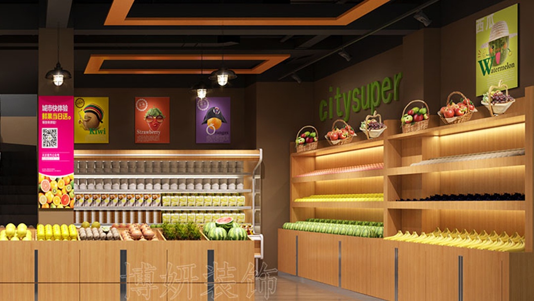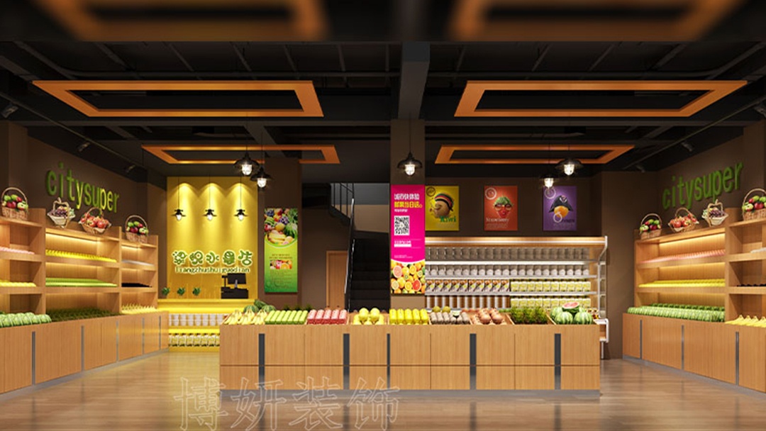 杭州連鎖水果超市裝修設(shè)計(jì),走進(jìn)店內(nèi),裸頂噴黑的處理打破常規(guī),營(yíng)造出工業(yè)風(fēng)與時(shí)尚感交織的獨(dú)特氛圍,讓空間更具縱深感與神秘氣息。橙黃色作為點(diǎn)綴色驚艷亮相,從招牌到店內(nèi)的裝飾線條,靈動(dòng)的橙黃如跳躍的音符,瞬間抓住顧客目光,傳遞出水果的鮮活與熱情,激發(fā)人們的購(gòu)買欲望。原木展示貨架,是店內(nèi)一大亮點(diǎn),天然的木紋質(zhì)感,給人質(zhì)樸、溫暖的感受。其合理的分區(qū)設(shè)計(jì),讓各類水果有序陳列,方便顧客挑選。橙黃與原木、黑頂相互映襯,既有時(shí)尚的沖擊力,又不失自然的親和力。在這里,顧客能盡情享受一場(chǎng)視覺(jué)與味覺(jué)的雙重盛宴。