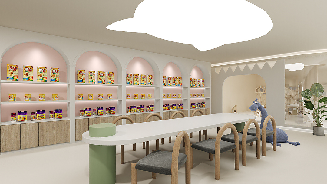 采用“模塊化隔斷+開放式布局”組合,劃分美容區(qū)、寄養(yǎng)艙、活體展示區(qū)及醫(yī)療操作間。例如犬類活動區(qū)鋪設防滑橡膠地板,貓柜采用雙層立體結構并嵌入隱藏式貓砂盆,提升空間利用率的同時減少寵物應激反應。 - 自然元素與治愈氛圍
