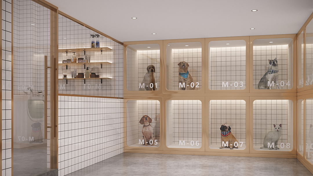 采用“隱形收納+模塊化家具”系統(tǒng),將美容臺、寄養(yǎng)艙、商品陳列區(qū)整合為可靈活調整的單元。例如犬類護理區(qū)配備可升降不銹鋼操作臺與隱藏式吹水機支架,貓柜則采用雙層結構搭配磁吸式食盆設計,最大化利用有限空間。 - 自然材質與智能科技應用