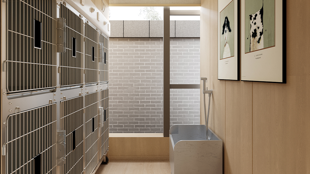 利用層高優(yōu)勢構(gòu)建雙層結(jié)構(gòu):一層設(shè)置活體展示區(qū)與美容SPA區(qū),二層規(guī)劃寄養(yǎng)艙與休閑互動區(qū)。例如犬類活動區(qū)采用防滑玻璃地板,貓柜則設(shè)計(jì)成樹屋式攀爬架,提升空間利用率。
