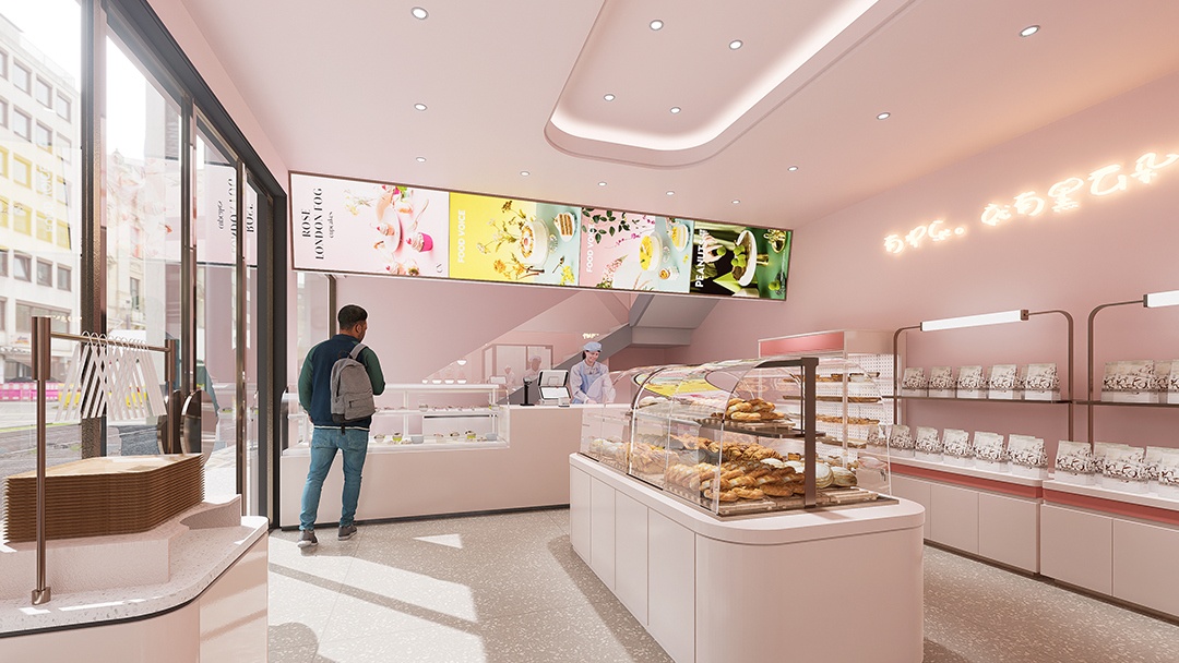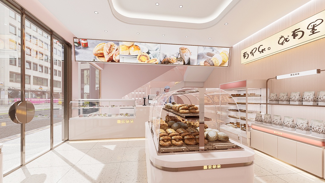 杭州網(wǎng)紅烘焙店裝修設(shè)計亮點,本案以“甜蜜劇場”為概念,打造沉浸式烘焙社交空間?;⌒螎u臺與翻糖藝術(shù)裝置形成視覺焦點,墻面采用漸變色手工肌理漆,呼應(yīng)馬卡龍主題色彩。臨街面設(shè)計折疊全景窗,搭配外擺休閑區(qū)增強互動感。重點打造“透明后廚長廊”與“自選原料市集”,結(jié)合暖調(diào)軌道射燈與定制復(fù)古面包陳列架,在強化生產(chǎn)可視性與產(chǎn)品新鮮度的同時,構(gòu)建高傳播性的打卡場景,實現(xiàn)功能與美學的雙向賦能。