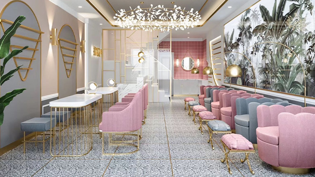 在杭州,這座兼具時尚基因與自然靈氣的城市,我們以INS風美學為靈感,將低飽和度粉色作為空間主調(diào),搭配生機盎然的綠植點綴,打造一處治愈感與高級感并存的指尖藝術(shù)空間。墻面,采用柔霧粉藝術(shù)涂料,搭配啞光白與淺灰家具,營造溫柔而不甜膩的視覺層次;弧形沙發(fā)、吊燈與幾何鏡面裝置,強化空間的輕盈感與現(xiàn)代趣味。綠植,成為空間呼吸的靈魂——從入口處的龜背竹墻到護理區(qū)的蕨類微景觀,再到窗邊的琴葉榕列陣,讓自然氣息滲透每個角落。智能補光美甲臺與無主燈設(shè)計結(jié)合,確保光線柔和均勻,讓每一次指尖創(chuàng)作都成為享受。在這里,杭州的精致與INS風的松弛完美交融,為都市女性提供一處逃離喧囂、沉浸美學的治愈驛站。