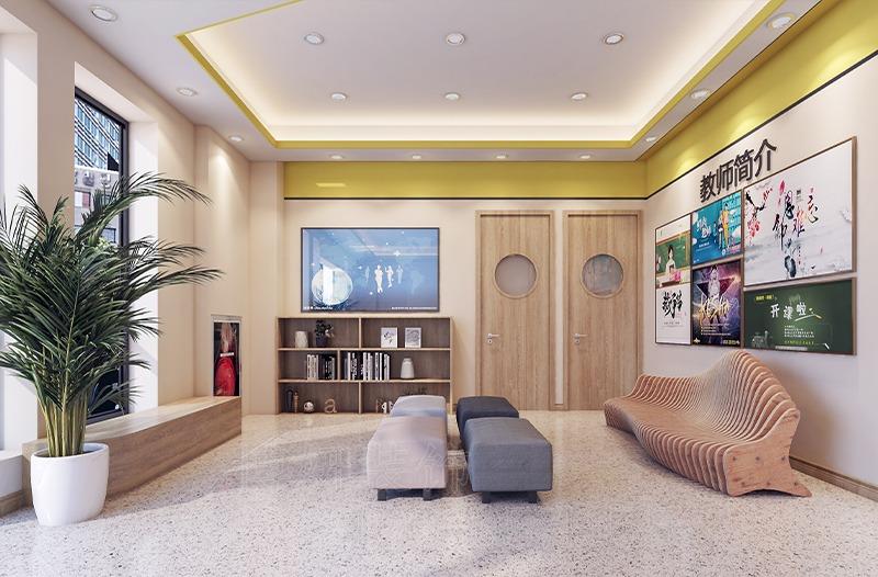 主色調(diào)建議選擇淺藍(lán)、米白等舒緩色系,局部用橙色、綠色點綴激發(fā)活力。例如,杭州某藝術(shù)培訓(xùn)機構(gòu)在教室墻面采用低飽和度莫蘭迪色系,搭配學(xué)員作品展示墻,既避免視覺疲勞,又增強空間互動性;而早教中心則通過卡通墻繪、動物造型燈具等元素,營造童話般的成長環(huán)境。
