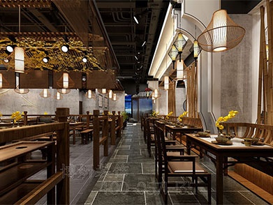 博妍裝飾突破傳統(tǒng)裝修思維,將餐飲空間視為品牌故事的立體化呈現(xiàn)。例如為杭州某川湘菜館設(shè)計(jì)的“煙火隱于市”主題空間,通過提取東方建筑中的拱形、柱體元素,結(jié)合現(xiàn)代洄游動(dòng)線,打造出半開放式包間與巨幅落日天幕燈裝置。空間中質(zhì)樸的夯土墻面、紋理感柱體與摩登中古臺燈形成沖突美學(xué),既傳遞“家常菜精致化”的品牌理念,又成為顧客自發(fā)傳播的社交貨幣。。