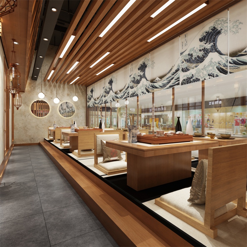 空間布局:采用“回字形”或“L形”動(dòng)線,將烹飪區(qū)、展示區(qū)與用餐區(qū)自然銜接,避免顧客與廚房操作產(chǎn)生距離感。