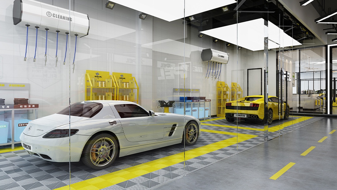 杭州汽車貼膜專營店裝修設(shè)計(jì),打造沉浸式貼膜體驗(yàn)空間。入口設(shè)動態(tài)色溫光柱陣列,呈現(xiàn)200+膜料在不同光照下的色彩變化。施工區(qū)采用十萬級無塵標(biāo)準(zhǔn),配備垂吊式膜料架與智能裁膜工作臺,墻面嵌入紫外線強(qiáng)度監(jiān)測屏??蛻艨赏ㄟ^互動色墻進(jìn)行虛擬改色預(yù)覽,定制區(qū)設(shè)材質(zhì)顯微鏡與耐久度測試儀。整體以科技白與金屬灰為基調(diào),將專業(yè)工藝轉(zhuǎn)化為可感知的視覺敘事。