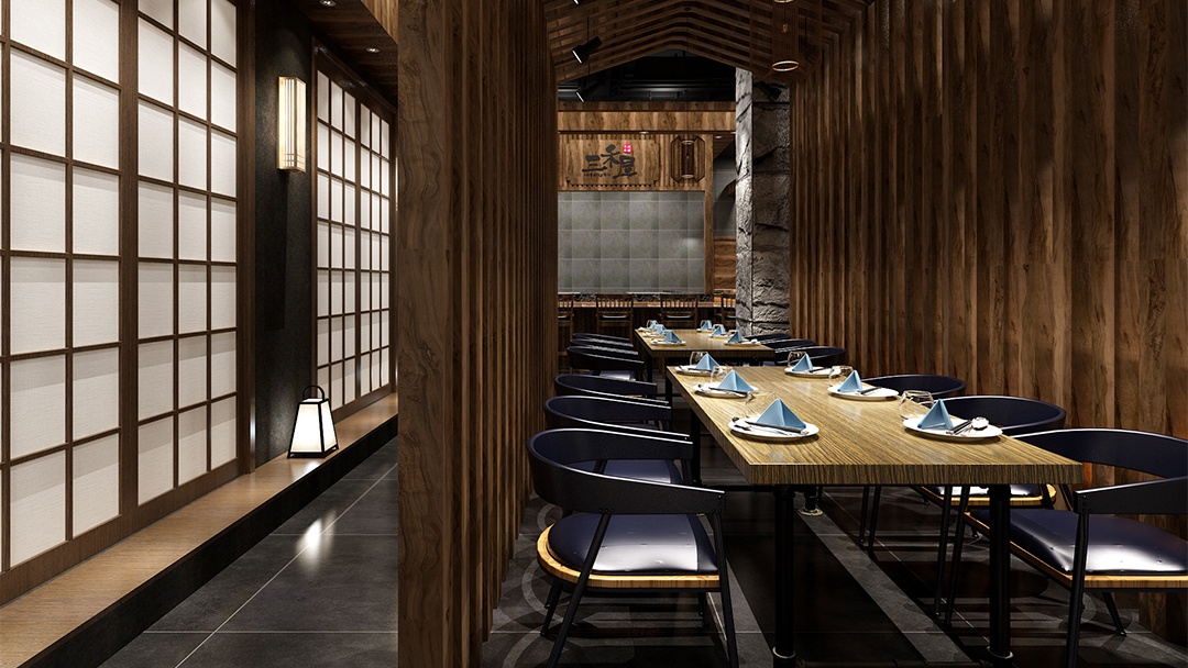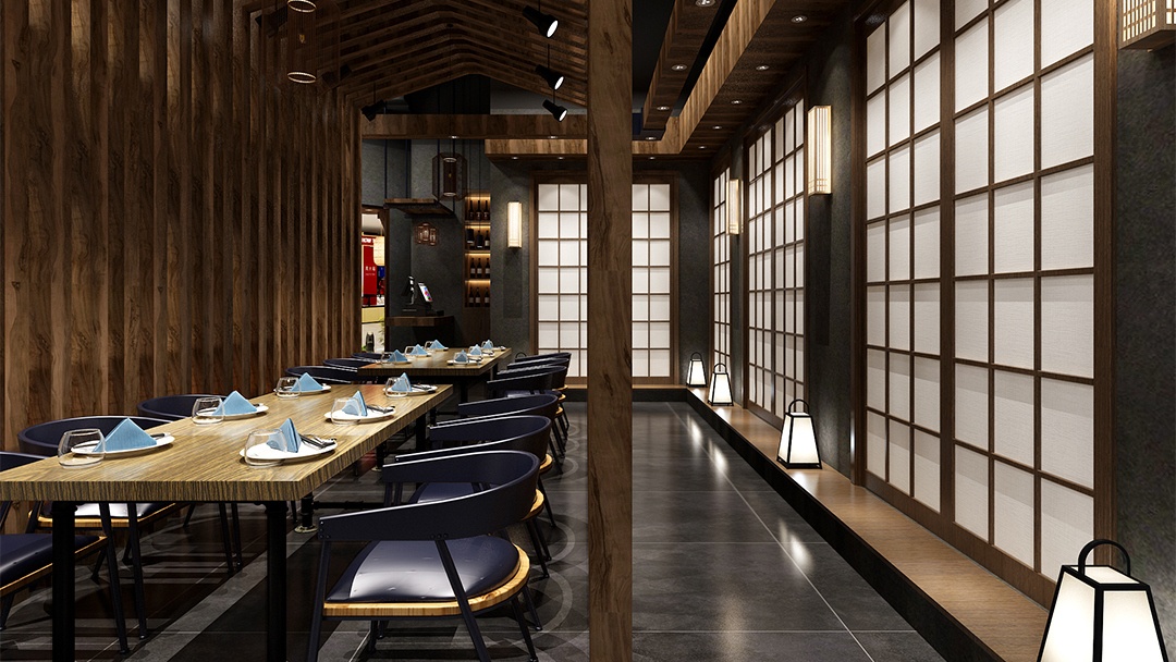 - 材質(zhì)與氛圍:選用原木、竹編、素色涂料等天然材料,搭配暖黃燈光與庭院枯山水造景,營造靜謐雅致的用餐環(huán)境。