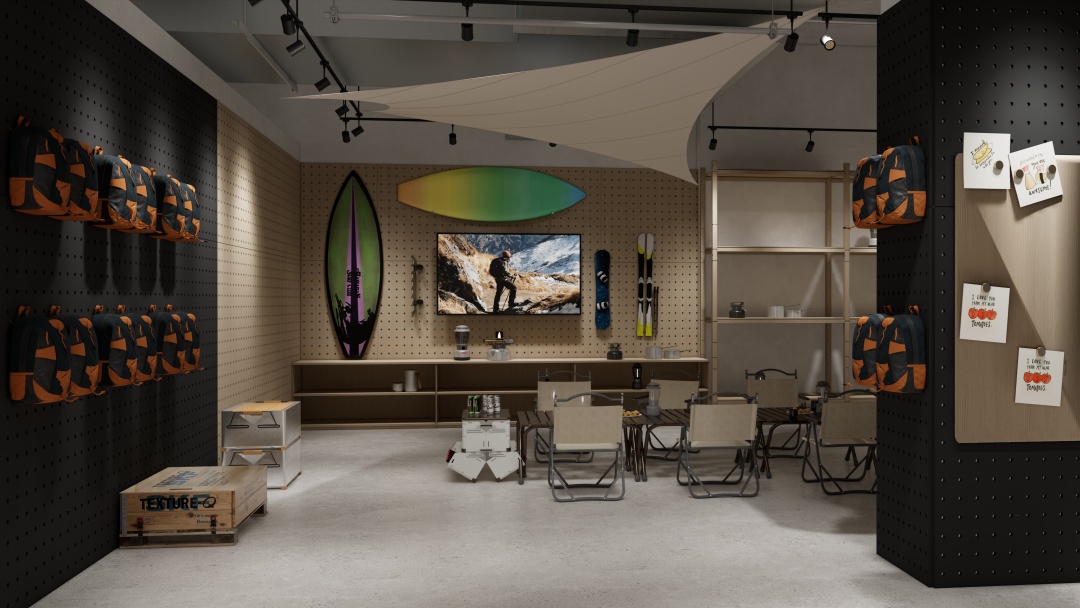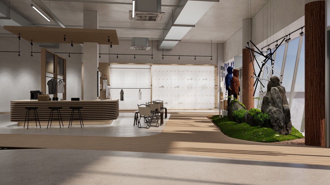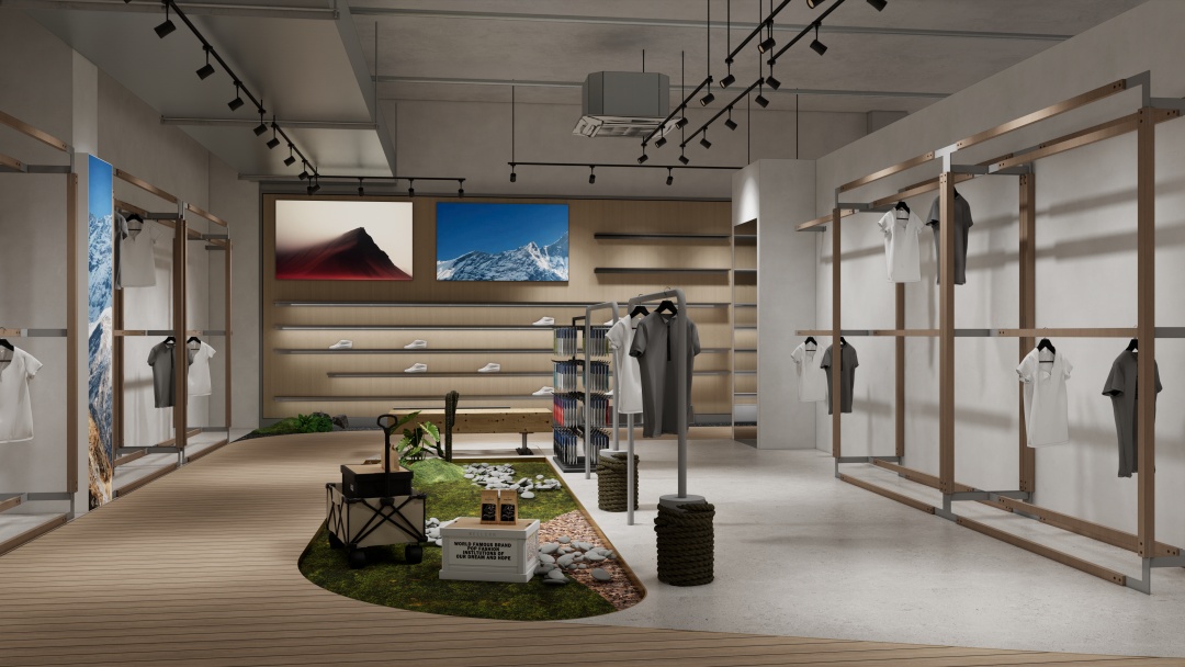 - 功能分區(qū)優(yōu)化:設(shè)置動(dòng)態(tài)展示區(qū)與靜態(tài)試衣間,通過高低錯(cuò)落平臺(tái)劃分區(qū)域,既保證顧客探索動(dòng)線的流暢性,又滿足裝備試用的專業(yè)需求;