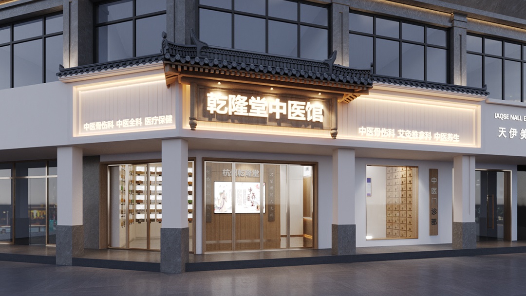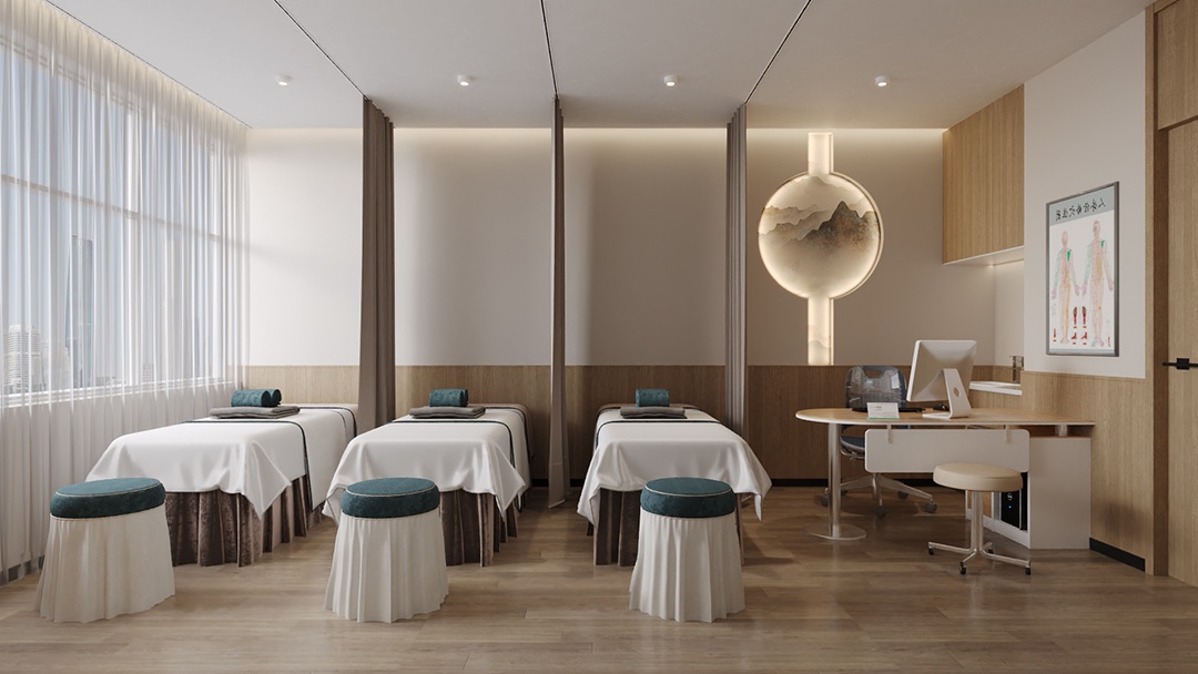 杭州新中式中醫(yī)館裝修設(shè)計(jì),本案以“承古煥新”為理念,將江南文人精神與中醫(yī)“天人合一”哲學(xué)相融合??臻g以胡桃木格柵與素色麻布為基底,藥柜區(qū)采用銅件包邊的百子柜陣列,配以隱形LED燈帶突顯藥材質(zhì)感。候診區(qū)引入天井景觀,設(shè)置枯山水與藥用植物盆栽,營造靜心氛圍。診療室采用可移動(dòng)宣紙屏風(fēng)分隔,墻面嵌入經(jīng)絡(luò)穴位發(fā)光示意圖,整體以溫潤材質(zhì)與克制用色,構(gòu)建既有文化認(rèn)同感又符合現(xiàn)代診療效率的療愈空間。