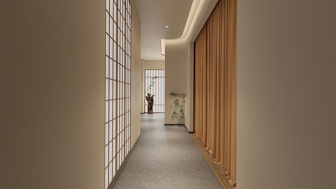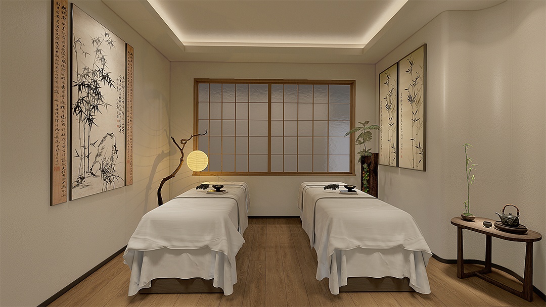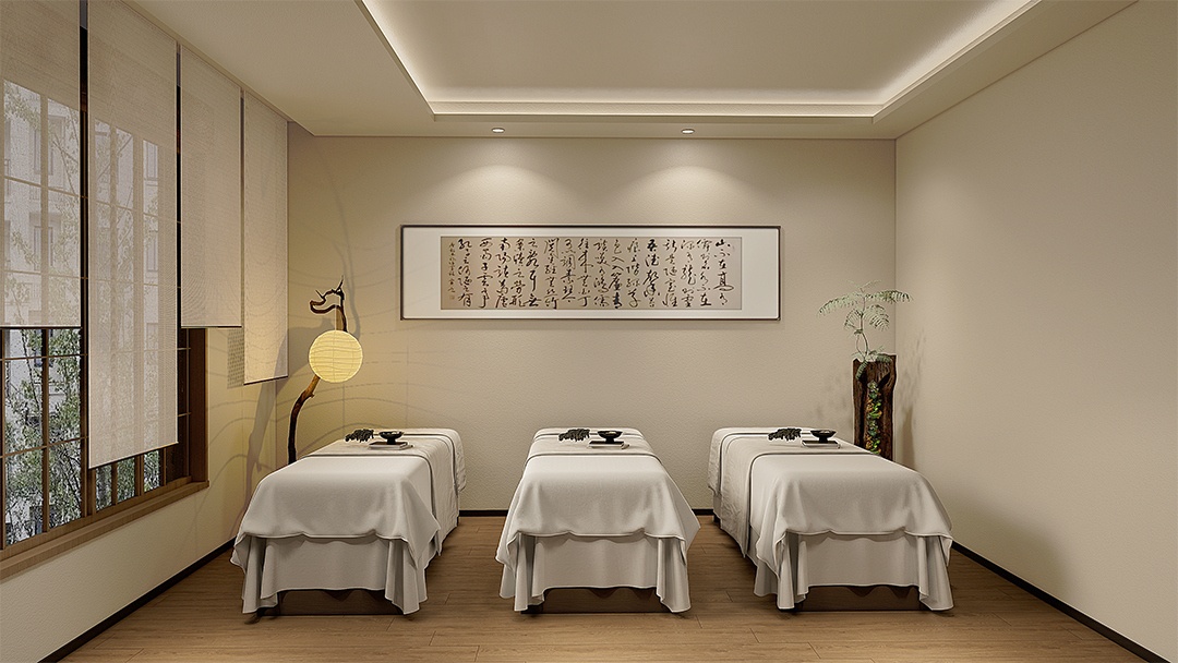 杭州新中式推拿館裝修設(shè)計(jì),融合東方美學(xué)與現(xiàn)代舒適需求??臻g以淺灰墻面與原木格柵構(gòu)筑雅致基底,理療區(qū)采用可升降中式榻榻米床榻,搭配鏤空花窗隔斷與可調(diào)角度射燈。墻面嵌入動(dòng)態(tài)山水紗幔投影,背景音效模擬溪流鳥(niǎo)鳴。草藥熏蒸區(qū)以銅制云霧裝置呈現(xiàn)可視化蒸汽理療,整體以麻織品、竹編與溫石材質(zhì)點(diǎn)綴,營(yíng)造身心同息的沉浸式調(diào)理場(chǎng)景。